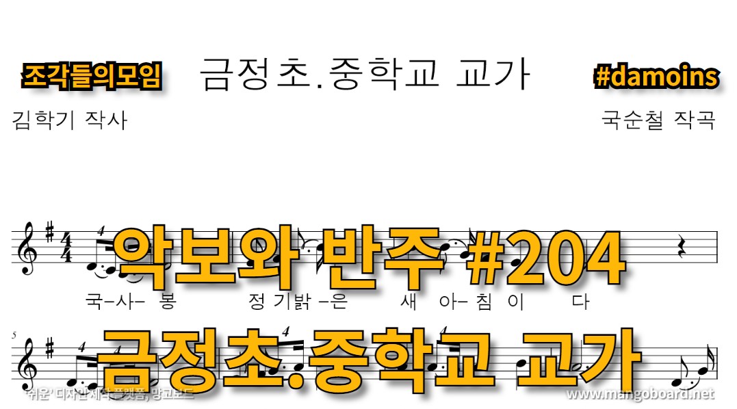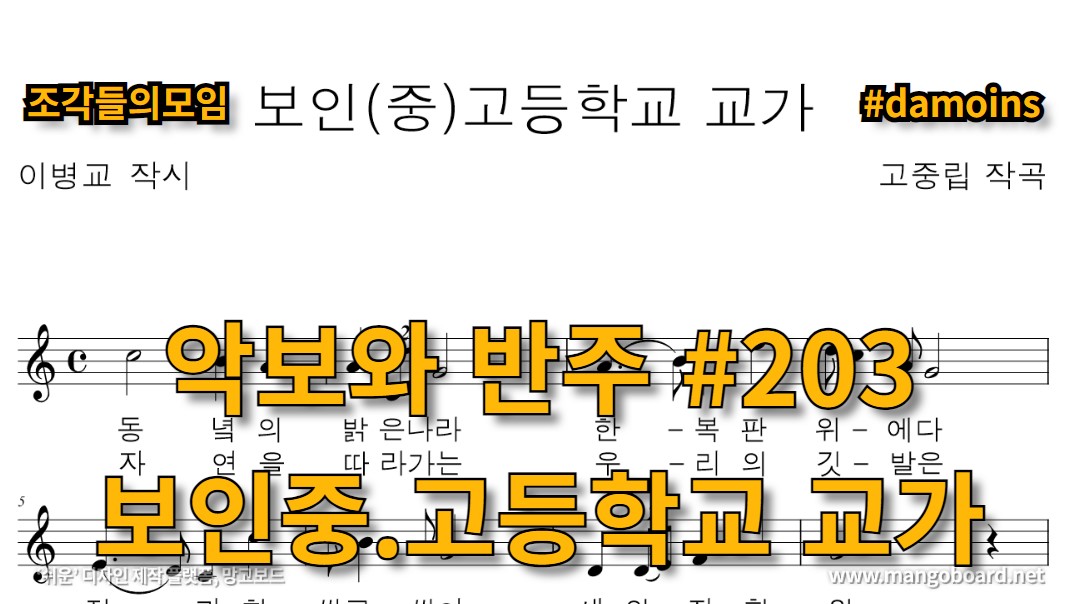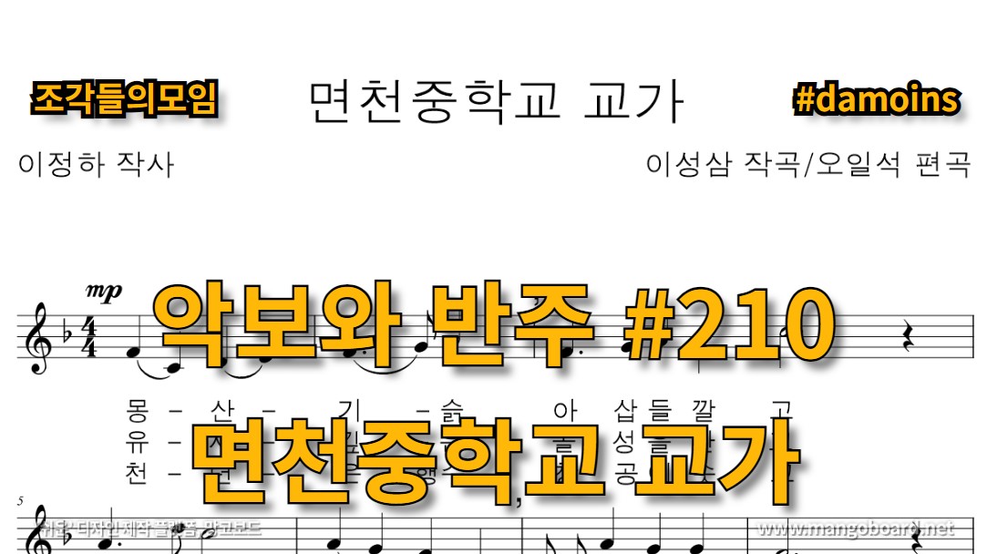 악보와 반주 교가 면천중학교 교가를 프로그램을 사용하여 악보로 만들어 보았습니다. Crescendo 악보사보 프로그램 악보를 그릴수도 있으며 반주를 들어 볼 수도 있네요 이정하 작사 이성섬 작곡 오일석 편곡 몽산기슭 아삽들깔고 태극기 앞에 배움을 맹세한 성심을 아로새긴 밝은마음씨 우리들은 향토의선구자 유서깊은 돌성을 안고 반딧불눈빛 촌음을 아끼며 정진에 갈고닦아 슬기로와라 우리들은 겨레의봉사자 천년은헹수창공에솟고 비바람 눈서리고난을 헤치며 쾌활한 몸지킴에 씩씩한말씨 우리들은 조국의 선구자 충청남도 당진시 면천면 면천서문1길 35 (성상리)에 위치한 학교 1929년 5월 7일 : 면천공립농업보습학교 설립인가 1929년 5월 27일 : 면천공립농업보습학교 개교 1946년 9월 16일 : 면천공립중학교로 개칭..